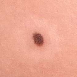 This lesion appears to be a melanoma because of its dark color, but it is benign. The lesion usually is present from childhood but sometimes emerges in later life.