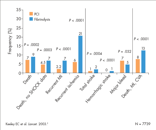 In a meta-analysis of 23 randomized clinical trials that compared fibrinolysis with emergent PCI for the treatment of STEMI, an early invasive strategy was superior to thrombolysis not only with respect to mortality but also with respect to stroke, reinfarction, recurrent ischemia, and major hemorrhage (Figure).1 In addition, fibrinolytic therapy has been shown to have limited efficacy in patients with STEMI who have had previous coronary artery bypass grafting (CABG) and in those who are in shock.2