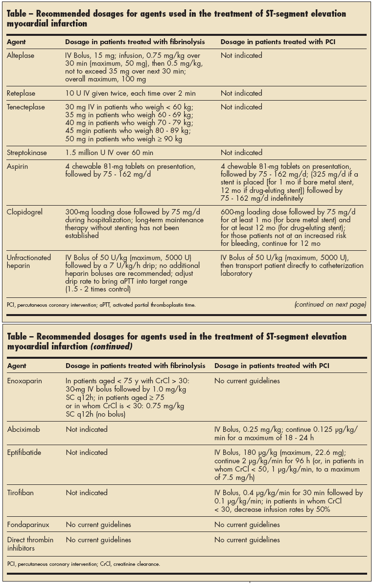 In addition to initial pharmacological therapy, the most important determinant of outcome in patients with STEMI is timely transportation to a high-volume PCI facility that has an experienced operator and team (door-to-balloon time, less than 90 minutes).3 However, in hospitals without access to PCI-either locally or by rapid transport-thrombolysis is indicated. Current guidelines recommend a fibrinolytic agent such as alteplase, reteplase, streptokinase, or tenecteplase. Thus, in the following review of antiplatelet and antithrombotic therapies for patients with STEMI, we have included recommendations for both patients being treated with PCI and those receiving fibrinolysis.