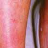 Case 1: The patient had marked pedal edema consistent with acute venous stasis dermatitis, A. It was precipitated by sitting outside for a long period in addition to sitting in the car on the way to and from the game. The condition improved with an increase in the dosage of her diuretic and the use of support hose.