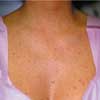 This asymptomatic acneiform outbreak erupted on the upper chest of a 24-year-old woman after she was hospitalized for an asthma exacerbation. Her medications include a nonsedating antihistamine, an oral leukotriene inhibitor, and a nonsteroidal inhaled bronchodilator.
