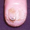 For several months, a 45-year-old woman has been bothered by changes to the lateral and proximal fingernail folds. A biopsy performed by another physician suggested verruca vulgaris. Treatment with cryotherapy and imiquimod brought no improvement.