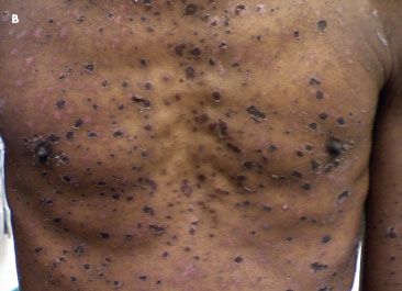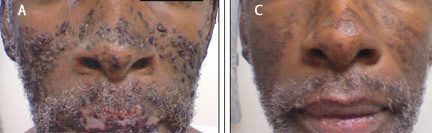 A 37-year-old man presented to the emergency department with painful, burning, blistering skin lesions (A, B). The lesions started 3 days earlier on the face and spread to the trunk and extremities. Ten days before presentation, the patient had received a diagnosis of AIDS. His CD4+ cell count was 12/μL. He had started therapy for HIV infection; his regimen included prophylaxis against Mycobacterium avium-intracellulare complex infection and Pneumocystis pneumonia. His medications included emtricitabine, lopinavir, azithromycin, and trimethoprim/sulfamethoxazole (TMP/SMX).