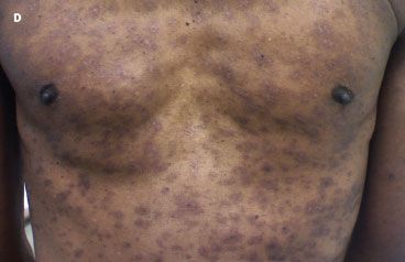 On the day the skin lesions appeared, the patient took it upon himself to stop all of these medications except TMP/SMX. Over the next 2 days, new lesions developed. There was oral and conjunctival mucosal involvement but no genital lesions.