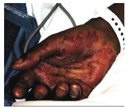 Over the next day, he complained of worsening pain, requiring treatment with morphine, and widespread, large blisters developed on his palms (Figure 2) and soles. The boy subsequently made a slow but continuous recovery without further alteration in management. He was discharged after 10 days, having reestablished adequate oral intake, without residual problems.