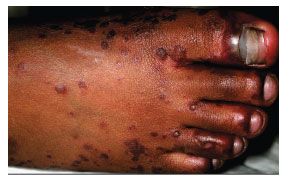 Figure 1. Macular and vesicular lesions on the dorsal aspect of the foot of a 14-year-old HIV-infected boy with Stevens-Johnson syndrome following treatment with thalidomide.