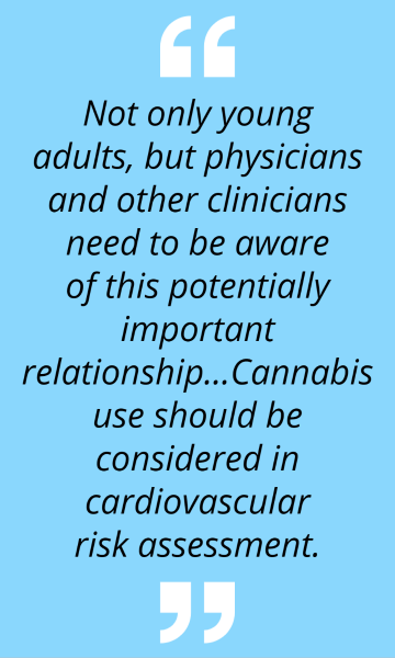 "Not only young adults, but physicians and other clinicians need to be aware of this potentially important relationship,” stated co-author David Mazer, MD, clinician scientist, Unity Health Toronto, in the press release. “Cannabis use should be considered in cardiovascular risk assessment. When making decisions about cannabis consumption, patients and physicians should consider its associated benefits and risks, in the context of their own health risk factors and behaviours."