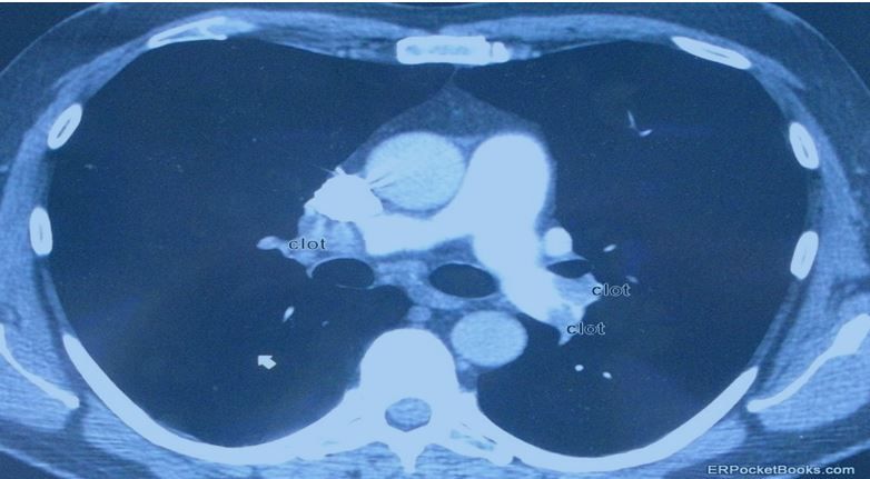 A subsequent chest CT scan (Figure 3) shows large clots in both main pulmonary arteries. This presentation would be somewhat atypical for unstable angina, since there is no chest discomfort. Dyspnea alone without any chest pain is not that atypical for a large PE, since the pain from a PE is thought to be the result of lung infarction, which is actually more common with smaller PEs. See Table below for more pitfalls in the diagnosis and management of PE.
