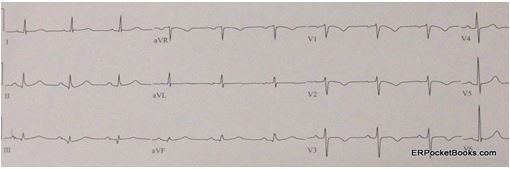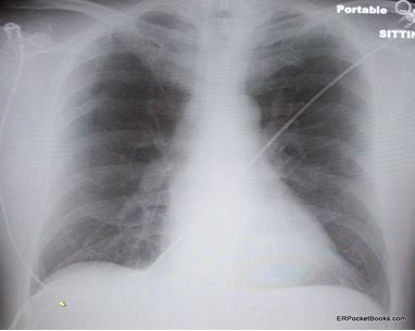 Blood work is ordered, including a CBC count, metabolic panel, and cardiac troponin-I, which are all normal. His chest x-ray film (Figure 1) and ECG tracing (Figure 2) are shown at left.