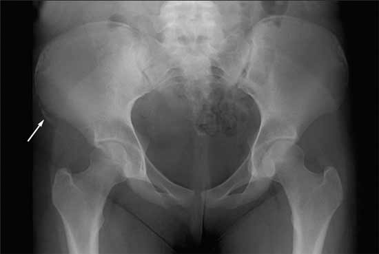 A 14-year-old girl came to the office with severe hip pain after she attempted a cheerleading maneuver on a trampoline. She was bouncing as high as she could and landed with her left knee flexed and her right hip extended. On impact, she felt a “pop” followed by right hip pain. After viewing her x-ray films, a radiologist diagnosed an avulsion fracture. The lower extremity is the most common body region injured on any type of trampoline. Fractures of the extremities occur frequently, but involvement of the trunk and pelvis is uncommon.