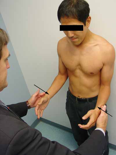 The rotator cuff may be injured when an athlete’s arm goes over his or her head, as in tennis, baseball, beach volleyball, and swimming. Weakness, especially in external rotation or abduction, is an important physical finding that indicates full-thickness rotator cuff tears. Testing of strength in external rotation is accomplished by having the patient place his arms at his sides with the elbows bent 90°. The examiner pushes against the patient’s wrists. Weakness in the patient’s resistance indicates some process affecting the infraspinatus muscle.