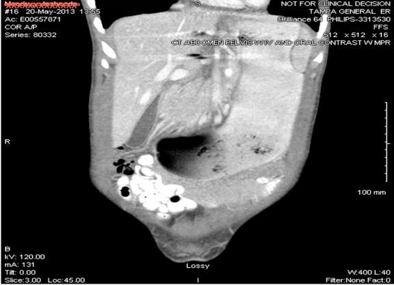Figure 1. CT scan of abdomen, pelvis with contrast showing gastric obstruction.