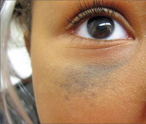 A 7-year-old African American girl presented with an asymptomatic gray lesion beneath her right eye that had appeared before her first birthday. She was a healthy child with macular gray discoloration on the right infraorbital skin. There was no abnormal pigment noted on the conjunctiva. She had nevus of Ota, also called oculodermal melanosis.