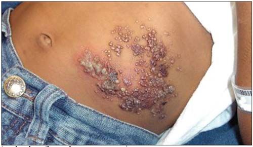 A 6-year-old boy had “redness and pain” of skin on his left upper abdomen. Physical examination revealed a large cluster of vesicles with underlying erythema and mild warmth. The lesion, present for 5 years, had been diagnosed as lymphangioma circumscriptum.