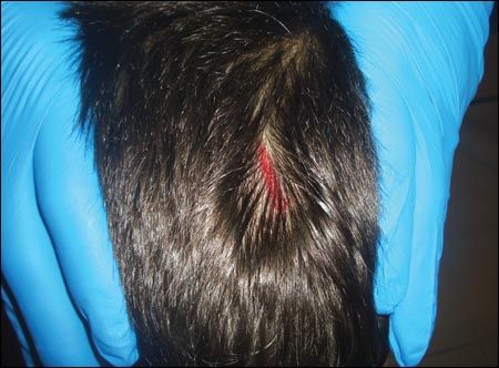 In addition, staples can be difficult to place when there is some separation of the wound edges. This is a common problem with larger scalp wounds. One technique that I find useful when stapling a scalp wound with separated edges is to have an assistant apply inward pressure to the scalp on both sides of the wound and at a distance from it (it is important that the pressure not be applied right next to the wound) (Figure 2). This removes all tension from the wound, easing placement of the staples and allowing for more precise closure.