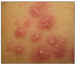 Lesions are initially tender, erythematous papules that coalesce into plaques with a mammillated surface. Marked edema within lesions confers a pseudovesicular appearance. Eruption may occur anywhere but is more likely on the head, neck, and upper extremities.3 Histopathology reveals a neutrophilic dermal infiltrate with occasional lymphocytes or histiocytes.3