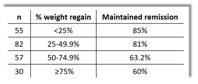 People with T2D and obesity who had gastric bypass surgery maintained significant levels of disease remission, despite up to 100% weight regain, study finds.
