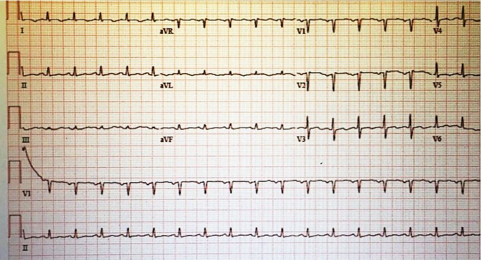 An hour later his temperature is 99.5°F but his pulse is still elevated and BP is now 108/69 mmHg. You perform an ECG; the tracing is shown at right (please click to enlarge).