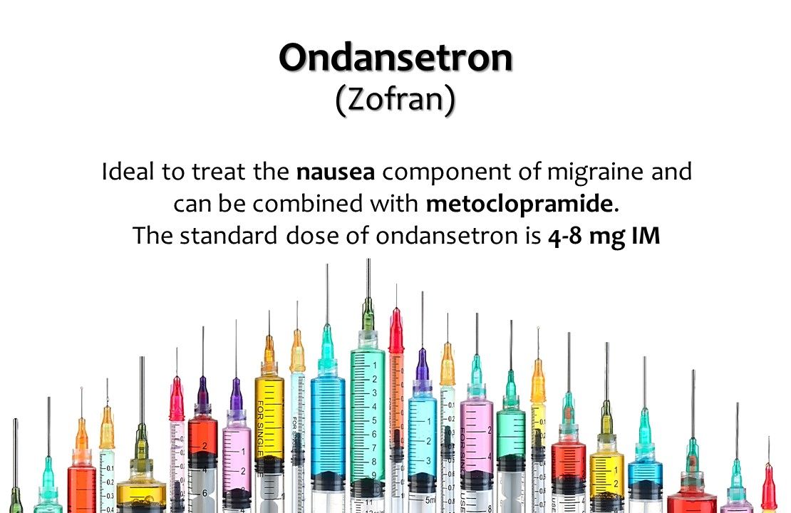3. Ondansetron (Zofran). A pure serotonin (5HT3) antagonist at the chemoreceptor trigger zone, this agent will not help the headache of migraine, but is great for the nausea component. Ondansetron may be combined with metoclopramide or used alone in those with sensitivity to Reglan. The standard dose of ondansetron is 4-8mg IM.