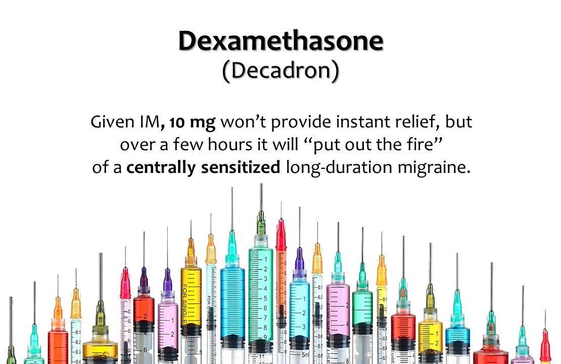 4. Dexamethasone (Decadron). Ten milligrams IM of this steroid will not alleviate the migraine instantly, but as a powerful anti-inflammatory, it will kick in over several hours (after the patient is home resting) and serves to “put out the fire” of a centrally sensitized long-duration migraine.