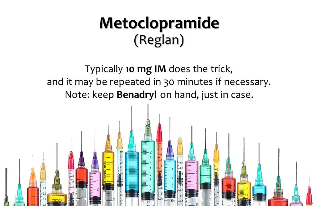 1. Metoclopramide (Reglan). In a recent study done in the ED at New York University, metoclopramide was felt to be the most effective migraine abortive agent. In your office it can be given as an intramuscular injection. Ten milligrams usually does the trick, and it may be repeated in 30 minutes if necessary. Remember that it is a dopamine D2 receptor antagonist, so akathisia may occur in 4% of patients and dystonic reactions in 0.3%. Both usually respond to intramuscular (IM) diphenhydramine (Benadryl, 25-50mg), so have a few vials on hand just in case.