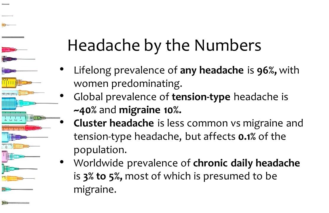 A lot of your patients have headache. It’s a simple numbers game, as you can see above.1 And, there are actually 200 or so other headache disorders behind these, according to the International Headache Society.