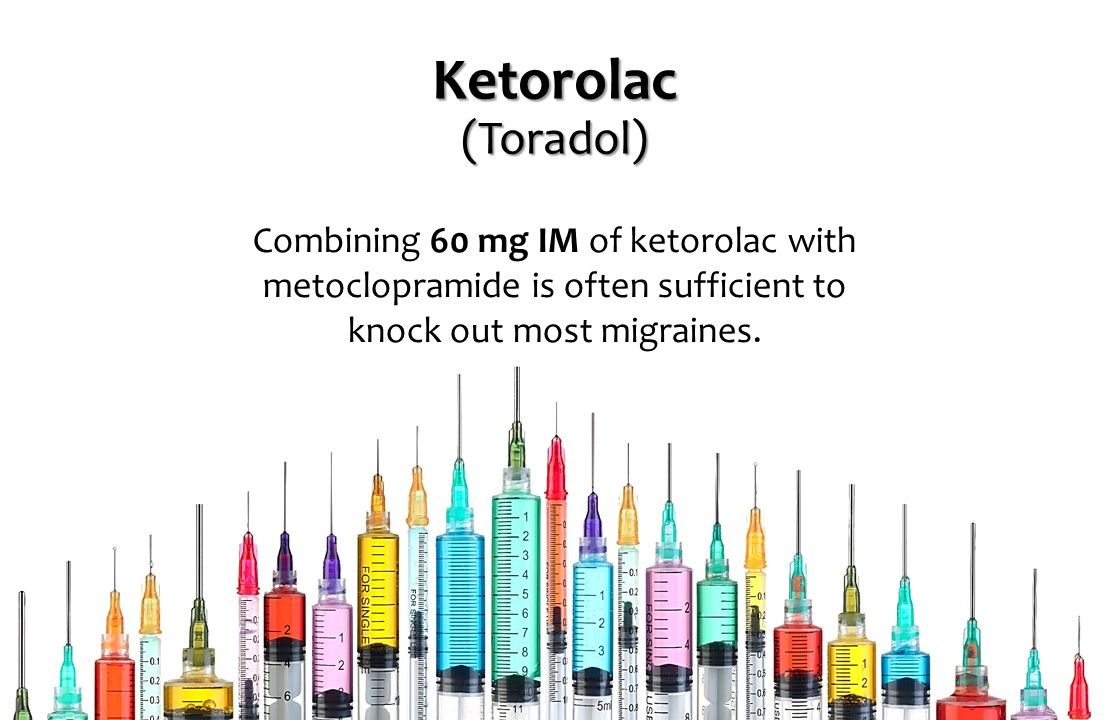 2. Ketorolac (Toradol). Combining 60 mg IM of ketorolac with metoclopramide is often sufficient to knock out most migraines. Since it is a potent nonsteroidal anti-inflammatory, use with caution (and consider halving the dose) in patients with impaired renal function. Ketorolac has a sting going in, and I find it helpful to warn patients of this.