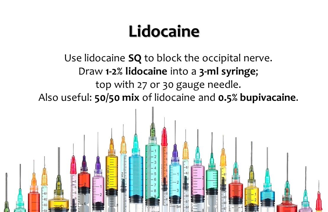 5. Lidocaine. In contrast to the above agents, we use lidocaine subcutaneously to block the occipital nerve, rather than administer IM. Generally, 1-2% lidocaine is drawn up into a 3-ml syringe, which is topped off with a 27 or 30 gauge needle (note: a 50/50 mix of lidocaine and 0.5% bupivacaine may also be used).