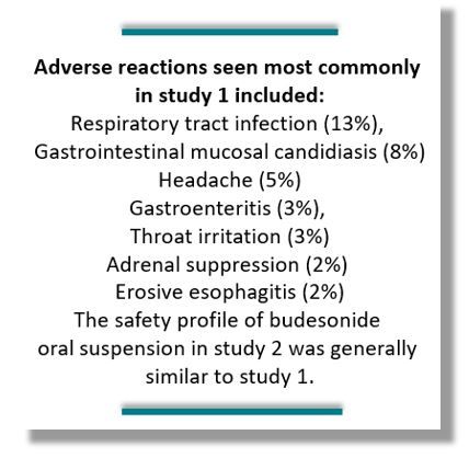 The absolute change from baseline in DSQ combined score significantly favored budesonide oral suspension vs placebo in both studies: study 1, 10.2 (1.5) vs -6.5 (1.8); and study 2, -14.5 (1.8) vs. -5.9 (2.1). Further, the company reported, during the final 2 weeks of each study, more participants on active treatment reported having no dysphagia or that symptoms they did experience “got better or cleared up” on their own vs those on placebo. Adverse reactions were similar in both studies (at left).