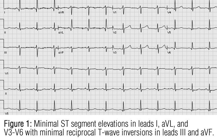 Results of laboratory tests revealed normal levels of blood urea nitrogen, creatinine, low-density lipoprotein cholesterol, magnesium, and phosphorus. However, the patient’s blood glucose level was 196 mg/dL, and her glomerular filtration rate was 48 mL/min. Her troponin T level had been 0.03 ng/mL at presentation; it subsequently rose to 0.21 ng/mL, and finally 0.23 ng/mL. An ECG revealed very minimal ST-segment elevations in leads I, aVL, and V3 through V6 with minimal reciprocal T-wave inversions in leads III and aVF (Figure 1).