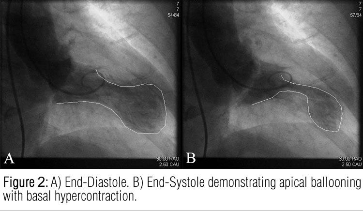 Apical ballooning on cardiac arteriography with left ventriculogram is typical of takotsubo syndrome and confirms the diagnosis. As seen in Figure 2, apical ballooning and basal hypercontraction can be visualized during systole. Another significant diagnostic finding is apical wall dyskinesia on an echocardiogram.1,2