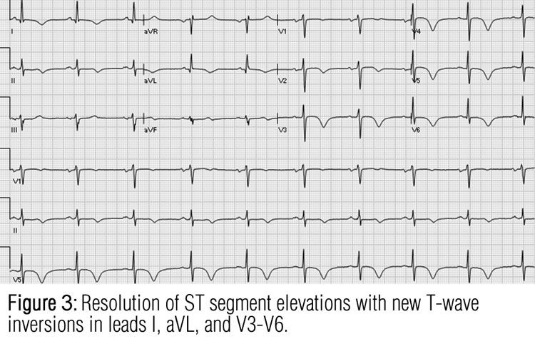 A follow-up ECG demonstrated a resolution of ST-segment elevations, but new T-wave inversions in leads I, aVL, and V3 through V6 were seen (Figure 3). The patient was discharged and directed to continue her usual course of medications. It was recommended that her primary care physician initiate insulin therapy because her current antihyperglycemic regimen no longer appeared to provide adequate control. Her hemoglobin A1C level remained at 9.7% suggesting an average glucose level of 230 mg/dL. The patient was advised to avoid any strenuous activity until her follow-up within 1 to 2 weeks.