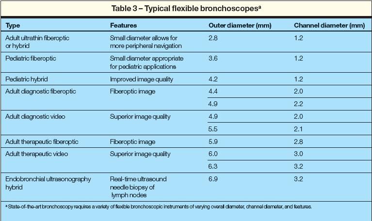 State-of-the-art bronchoscopy requires a variety of flexible bronchoscopic instruments of varying outer diameter, channel diameter, and features (Table 3). The smallestdiameter (approximately 2.2 mm) bronchoscopes commercially available in the United States are referred to as ultrathin bronchoscopes. Their small diameter allows for navigation into the distal airways, but their utility is limited by the lack of a working channel and fiberoptic imaging.