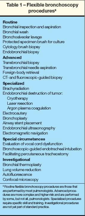 Flexible bronchoscopy can be divided into routine, advanced, and specialized procedures (Table 1). Routine bronchoscopy is performed by most pulmonologists and includes inspection and sampling. Inspection involves a survey of the upper and lower airway, with attention to the appearance and function of the vocal cords, the tracheal and bronchial anatomy, and the airway mucosa.