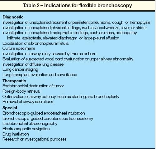 Flexible bronchoscopy can be performed for diagnostic purposes, such as the investigation of hemoptysis or a radiographic abnormality, or for therapeutic purposes, such as laser resection of a tumor or airway clearance (Table 2). As noted above, flexible bronchoscopy may also be