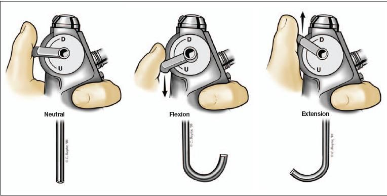 Figure 2 – Flexion and extension of the distal tip of the bronchoscope are illustrated here. With the lever in mid-position, the distal tip of the bronchoscope is in the neutral position. When the lever is pushed down, the tip of the bronchoscope is flexed forward up to 130 degrees (flexion). When the lever is pushed up, the tip of the bronchoscope is extended backward up to 110 degrees (extension).