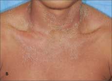 Desquamation begins on the face in fine flakes toward the end of the first week of the illness and continues on the trunk and finally on the hands and feet for up to 6 weeks (Figure). The duration and intensity of desquamation vary with the intensity of the rash.