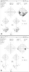 On examination, the patient's best corrected visual acuity was 20/20 in each eye. No afferent pupillary defect was noted. Intraocular pressures were elevated at 28 mm Hg in the right eye and 30 mm Hg in the left eye. On gonioscopic evaluation, the anterior chamber angles were open to the ciliary body. Slitlamp examination revealed mild lenticular nuclear sclerosis. A dilated fundus examination showed evidence of cup-to-disc asymmetry with temporal sloping of both optic nerve heads (A and B). A computerized visual field analysis identified a dense right inferior homonymous quadrantopsia and a Bjerrum scotoma (arcuate nerve fiber bundle defect with breakthrough to the blind spot) inferotemporally in the left eye (C and D). A small scotoma was also present in the supratemporal quadrant of the left eye (C).