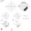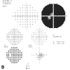 Automated visual field perimeters typically use a grayscale format that shows any defects as darkened areas. Black represents severe visual loss; gray represents moderate visual loss or depression. This representation provides an immediate idea of the size and severity of the defects. The numeric grids give the threshold in decibels for all points checked, which helps quantify the depth of the defect.
