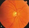 At an examination 2 months after the prednisone was started, the patient's best corrected visual acuity was 20/20 in the right eye and 20/30 in the left eye. The patient had to move his head around to find the slit of vision with his left eye. A prominent afferent pupillary defect was noted in this eye. The slitlamp examination revealed early lenticular nuclear sclerosis in both eyes. The fundus examination findings were normal in the right eye; however, the left optic nerve head was pale (A). This sign of optic atrophy correlates with the afferent pupillary defect. A computerized visual field analysis was normal in the right eye; in the left eye, it showed dense extensive loss except for a small island of vision just off axis to the central point of fixation (B).