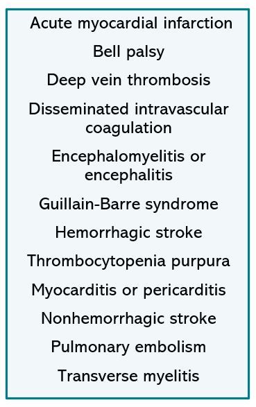 For their primary outcomes, Harris et al used a list of 12 serious adverse events identified by the US Food and Drug Administration that could potentially occur after mRNA vaccination (figure) and a composite of thromboembolic events. The secondary outcome of interest was 28-day risk of diagnosed COVID-19.