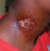Figure 1A 13-year-old girl of African American descent is brought to the pediatrician's office becauseof a lesion on her neck. The girl's mother had telephoned the office before the visit, statingthat the lesion resembled a blister at first, but now looked like a burn.In the office, the girl is afebrile and not distressed. She explains that she awoke themorning prior to the visit with a blister on the right side of her neck. It gradually becamebigger, and she used cold washcloths to wipe it. The central area became more painful andthe skin layers peeled off, revealing a weepy, inflamed circular area (