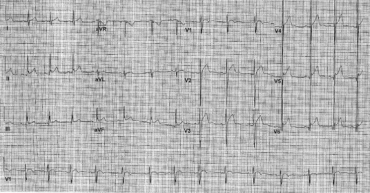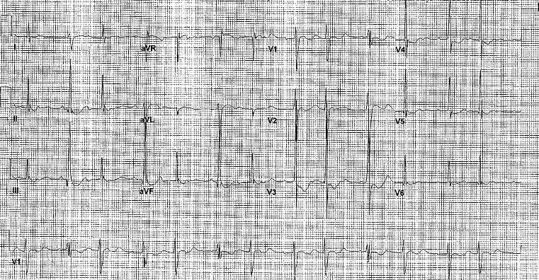 Thyrotoxic periodic paralysis (TPP) is a condition characterized by episodes of muscle weakness in individuals with high thyroid hormone levels. It is most prevalent among males of Asian descent.1 The condition is always linked to hyperthyroidism and thought to be an autosomal dominant disorder. A precipitating factor triggers excess insulin production with a subsequent dramatic shift of potassium from the extracellular to the intracellular compartment.2 The result is a state of profound hypokalemia which, in turn, causes muscle weakness and periodic paralysis.2 The ECG tracing may show T-wave flattening, a U wave preceding the T wave in the same polar direction, as well as conduction abnormalities.3 A life-threatening dysrhythmia is highly probable in the absence of immediate intervention.