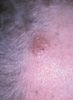 For 5 weeks, a 65-year-old womanhas had an asymptomatic, erythematous,slightly elevated papule onher right temple. There is no historyof trauma. She takes several medicationsfor mild hypertension andosteoporosis, but no new medicationshave been added in the past 6months.