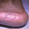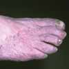 A markedly positive potassium hydroxide (KOH) examination confirmed the diagnosis of a dermatophyte infection (tinea pedis, A). The patient was given a topical antifungal cream as well as an antifungal powder, and the rash resolved uneventfully.