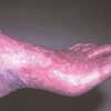 About 2 to 3 weeks after an 83-year-old woman underwent a knee replacement, pruritic rashes developed on her left foot and on both hands. She has not used any new soaps or worn any new clothing in recent months, and she is unaware of any exposure to contactants. She has not started any new medications, but she was exposed to unknown drugs during her hospitalization 2 months earlier for the knee operation.