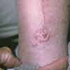 Tinea corporis is possible, but it is usually expanding and more pruritic than the lesion seen here; a potassium hydroxide examination would rule it out. Nummular eczema is another possibility, although it is rarely confined to a single lesion. The patient had no history of exposure to a contactant; moreover, the lesions associated with contact dermatitis are generally not as well demarcated as this rash. Psoriasis is also possible, although a solitary lesion in this location would be unlikely.