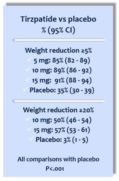 Researchers reported the average weight loss from study baseline to week 176 as 15.4% (5 mg), 19.9% (10 mg) and 22.9% (15 mg) compared to placebo (2.1%).1 During the 17-week follow-up period, SURMOUNT-1 participants who had discontinued tirzepatide treatment began to regain lost body weight and showed some increase in progression from prediabetes to T2D, according to Lilly.1 The result, compared to placebo treatment, was an 88% reduction (P <.001) in risk of worsening hyperglycemia with the potential for developing T2D.1