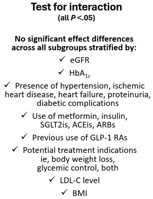 In a head-to-head real world study, tirzepatide compared with semaglutide resulted in 42%, 20%, and 46% reduced risks for all-cause mortality and major adverse CV and renal events, respectively.