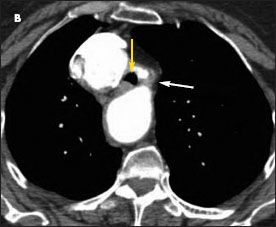 Figure 2 – A highresolution CT scan of the chest confirmed the finding of a right-sided aortic arch and revealed marked narrowing of the trachea (B, yellow arrow) and a fibrous band between the left subclavian artery and the descending aorta (B, white arrow). The tracheal narrowing was apparent when comparing the view at the level of stenosis (B) with the cephalad (A) and caudad (C) views.